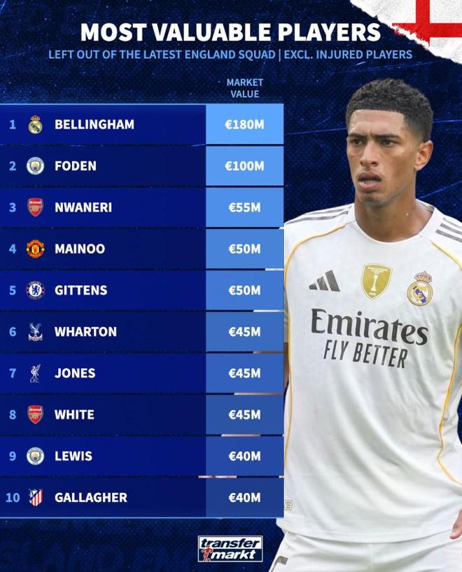 英格蘭隊公布了最新一期球隊大名單,德轉(zhuǎn)盤點了本次未能入選的球員身價榜(受傷球員除外)。