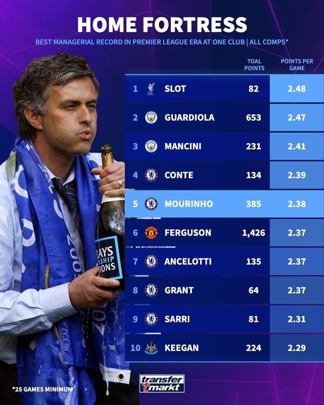 德國轉會市場網站列出了英超執(zhí)教單一球隊各項賽事主場場均積分榜,利物浦主帥斯洛特以2.48分居首,瓜迪奧拉第二,穆里尼奧執(zhí)教切爾西時期排名第五。