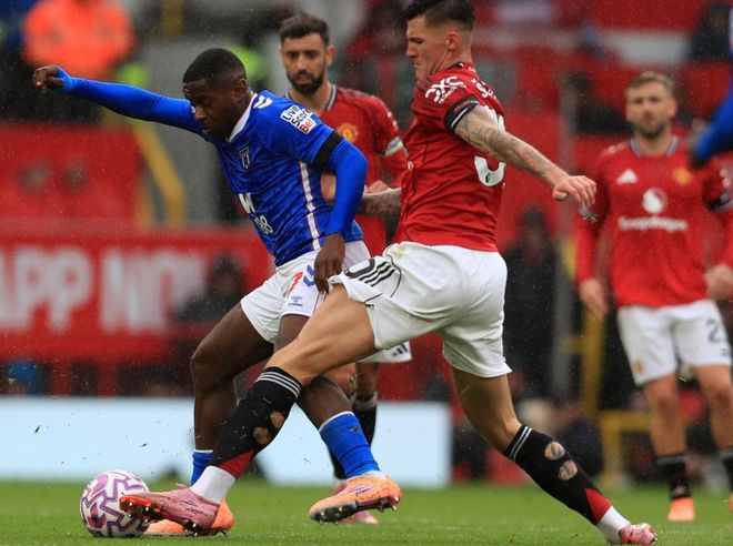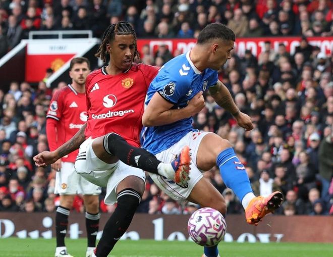 比賽剛剛開始8分鐘,曼聯(lián)就進球了!姆伯莫在右側起球傳中,禁區(qū)中路的芒特用左腳卸球,右腳直接凌空低射,皮球鉆入球門右下角!芒特一停一射處理得太瀟灑寫意了!曼聯(lián)取得夢幻般的開局。第21分鐘,迪亞洛右側帶球內切兜射遠角,被撲了出去。隨后,姆伯莫的遠射也是被門將化解了。4分鐘后,布魯諾-費爾南德斯遠射中框,迪亞洛頭球補射,頂偏了。