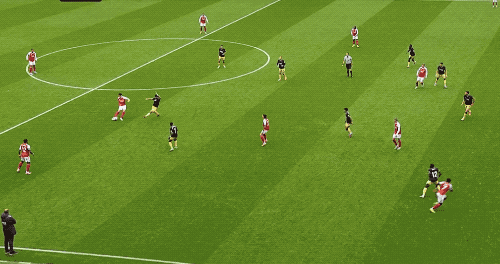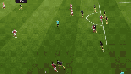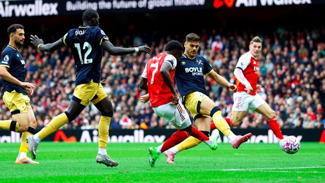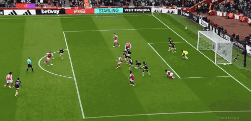 第38分鐘,薩卡策動(dòng)進(jìn)攻,蘇維門(mén)迪的直塞恰到好處,埃澤的怒射被撲出,賴斯補(bǔ)射,槍手取得領(lǐng)先。