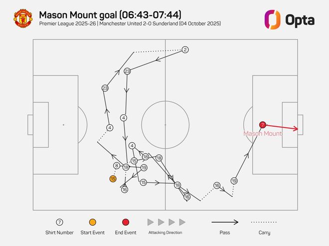 英超第7輪,曼聯(lián)主場對陣桑德蘭,上半場芒特破門為曼聯(lián)首開記錄,這粒進球經(jīng)歷了連續(xù)18次傳球,為曼聯(lián)近兩年來英超進球前最長傳球。